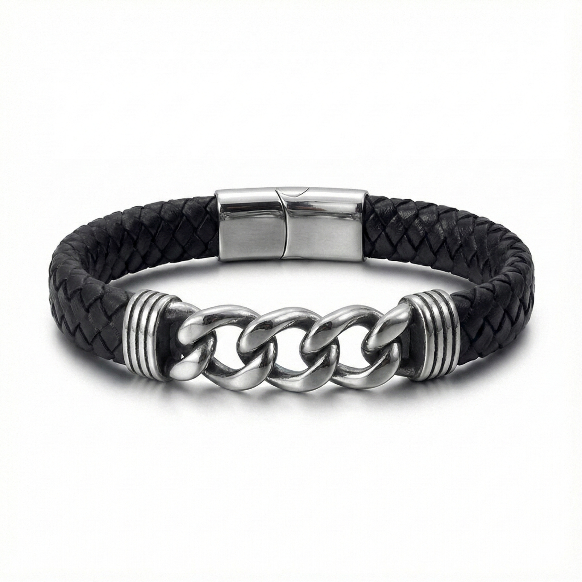 The Sentinel Chain & Leather Bracelet conveys strength through structure and balance. Defined by its bold central link, this piece represents stability, protection, and controlled power.